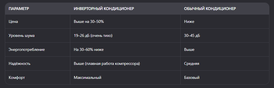 ❌ Более высокая начальная цена Да, инверторный кондиционер стоит дороже на 30–50%. Но разница окупается за 2–3 сезона благодаря экономии на электричестве и меньшему износу.