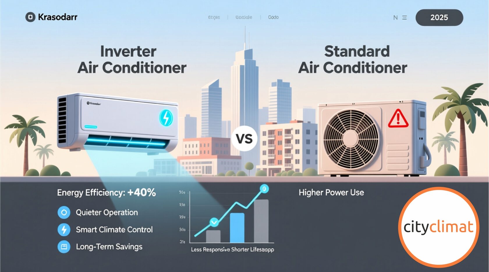 Разбираемся, какой кондиционер лучше выбрать в Краснодаре в 2025 году — инверторный или обычный. Сравниваем по цене, уровню шума, надёжности и энергопотреблению. Подбор модели под вашу комнату — бесплатно!